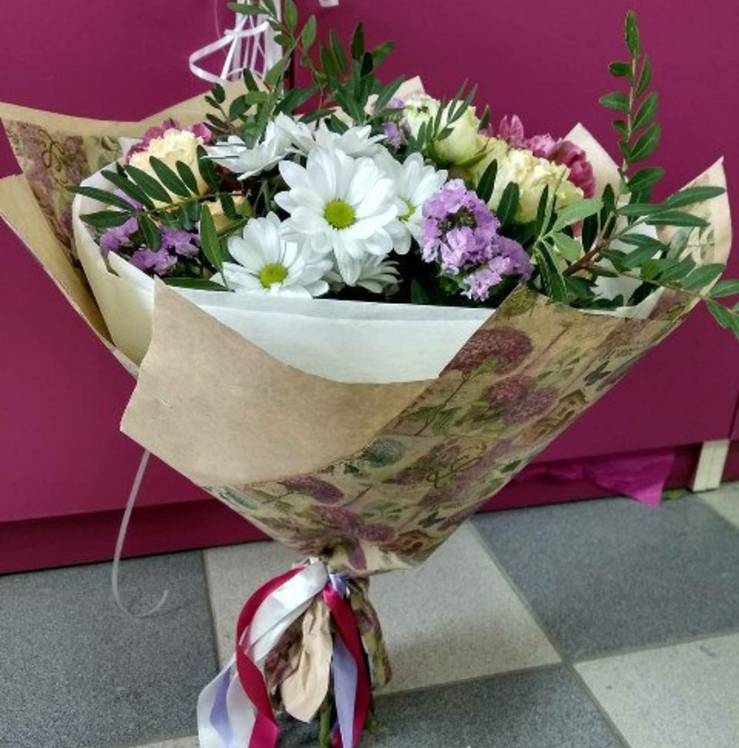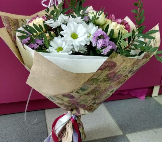 Хризантема, роза кустовая, альстромерия, статица, зелень