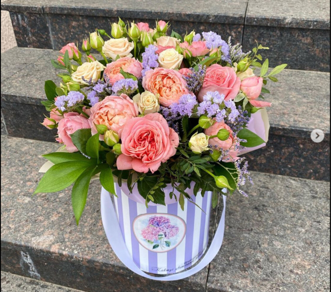 Коробка с цветами послужит отличным подарком или дополнением к нему. Композиция выполнена на основе флористической губке, котороая удерживает влагу, что позволяет цветочкам не вянуть длительное время.