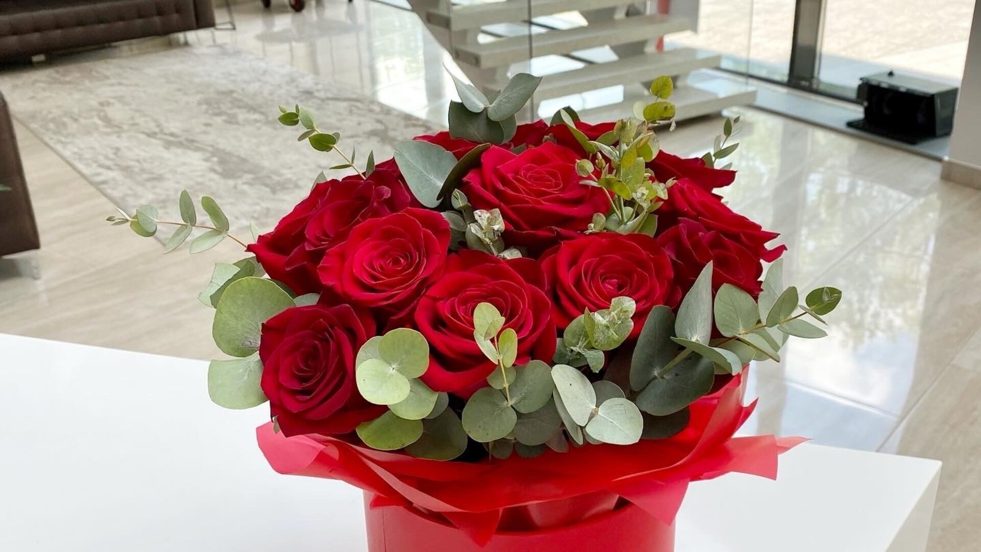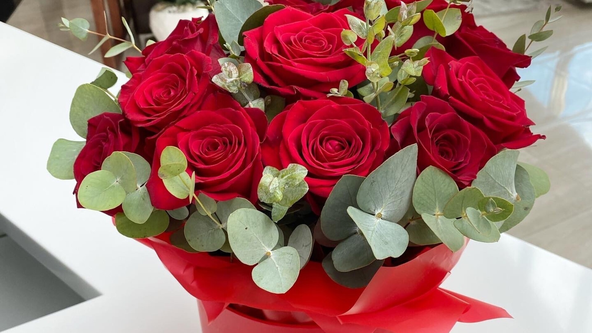розы, эвкалипт, шляпная коробка, оазис