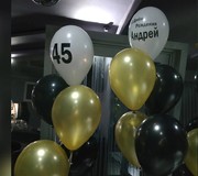Оформление помещения гелиевыми шарами с индивидуальными надписями в черно-золотой палитре. Оформление фотозоны