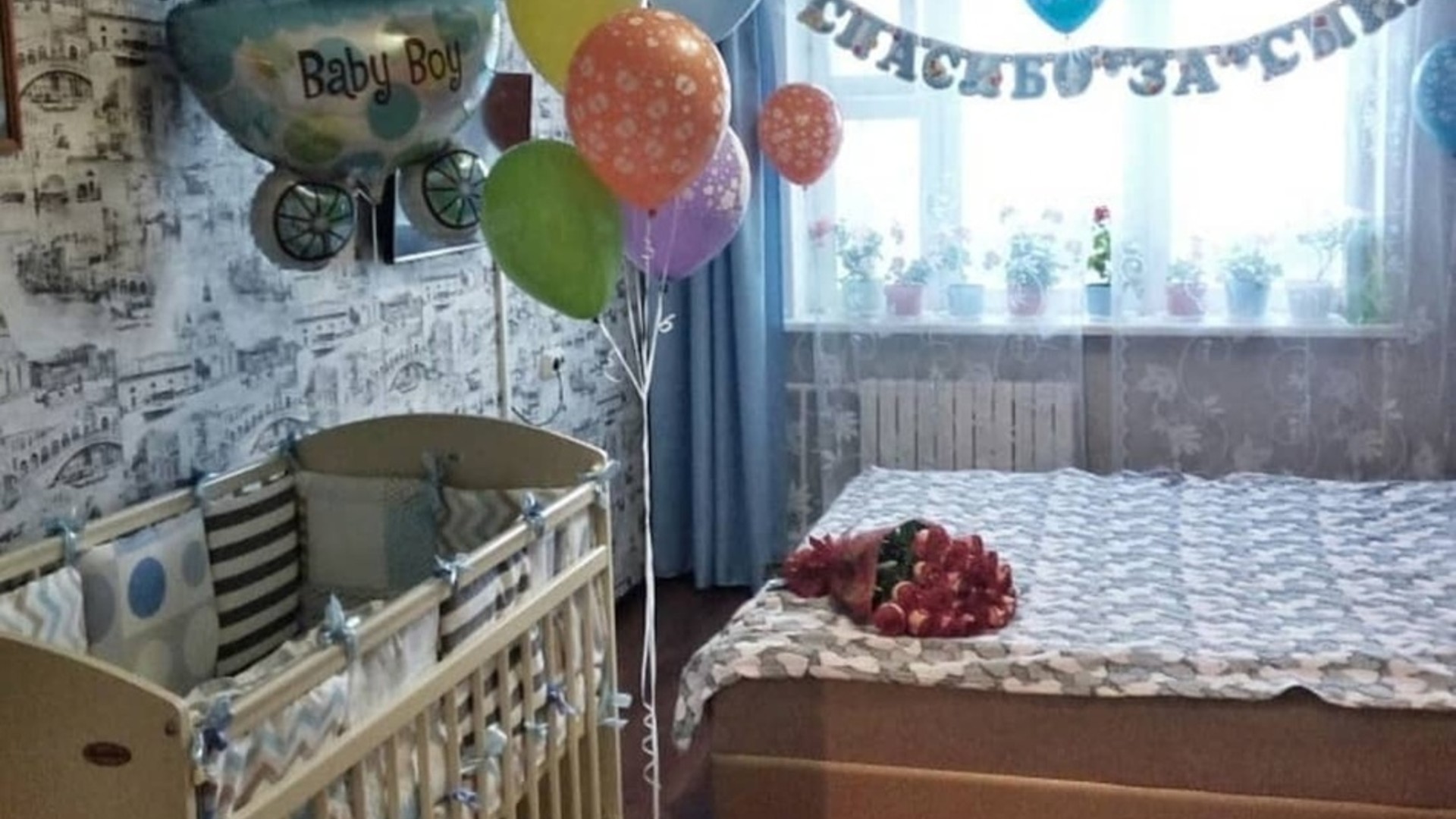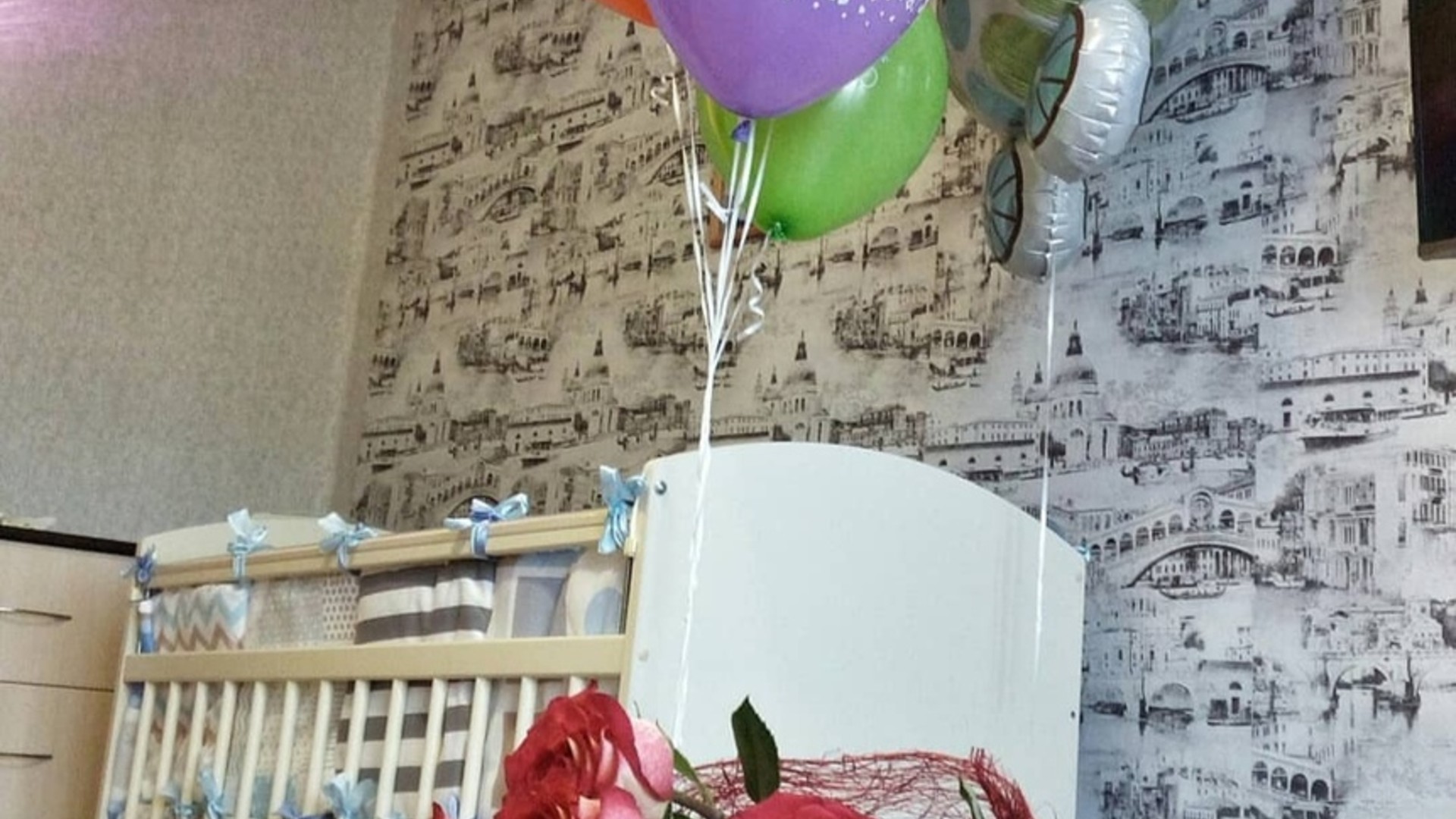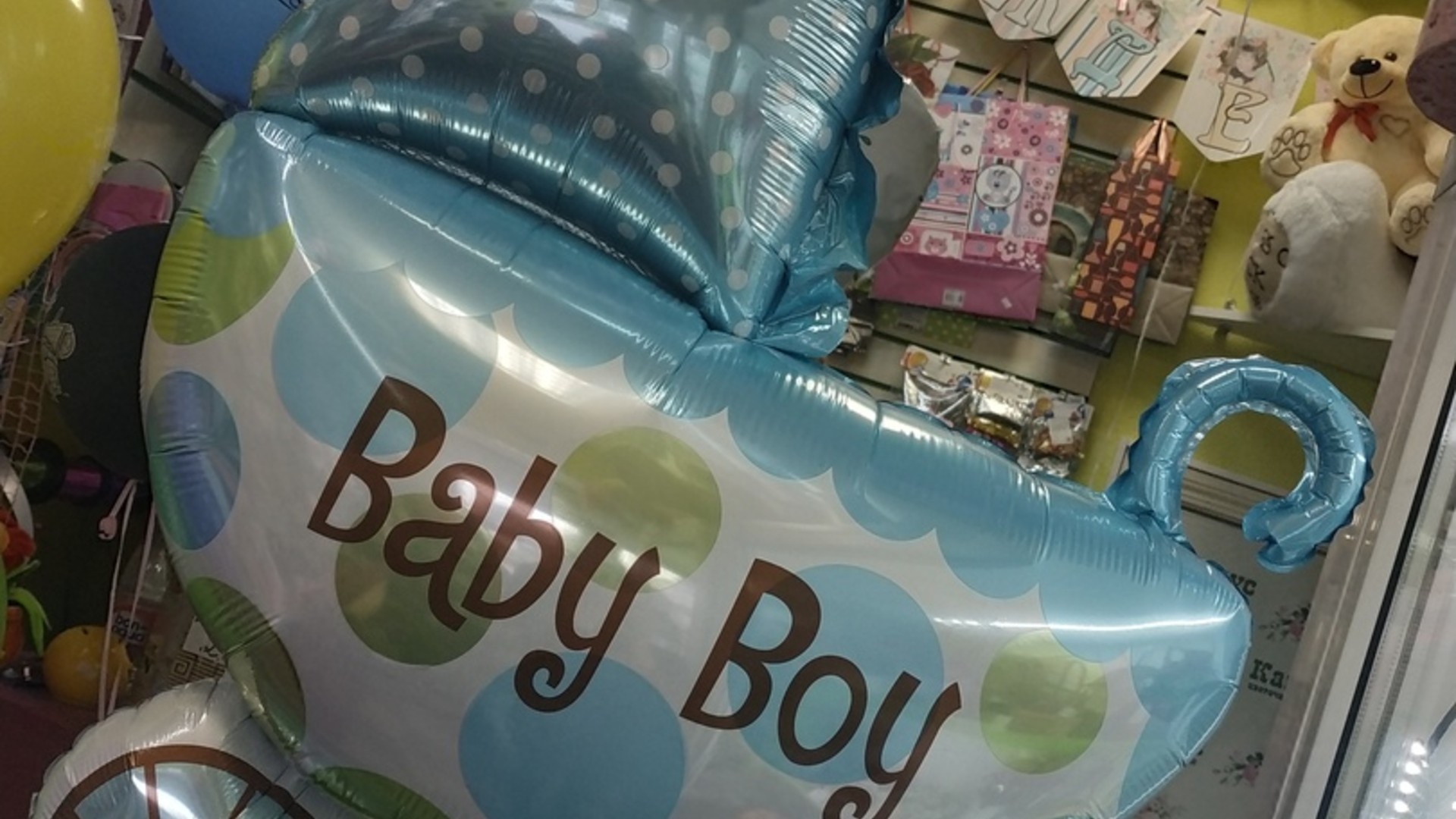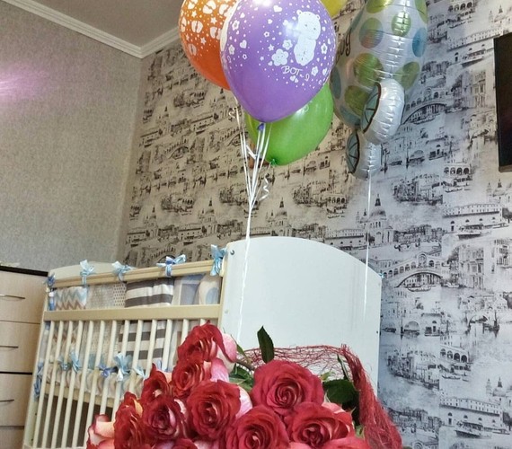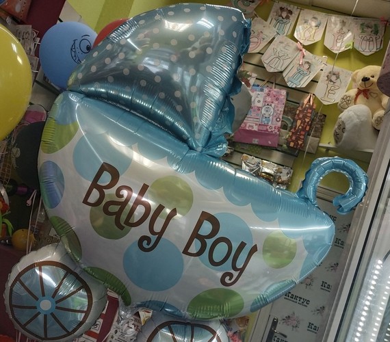 Шары на выписку из роддома. Большая фольгированная фигура, средняя фольга и шары в голубых тонах