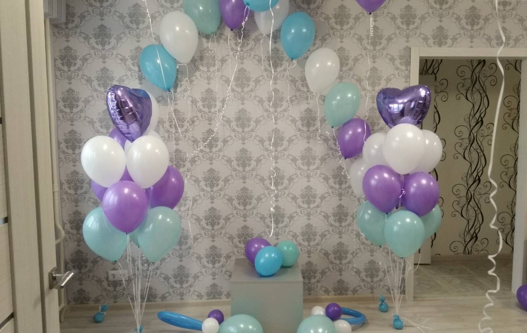 Украшение комнаты для выписки из роддома, арка, два фонтана из гелиевых шаров