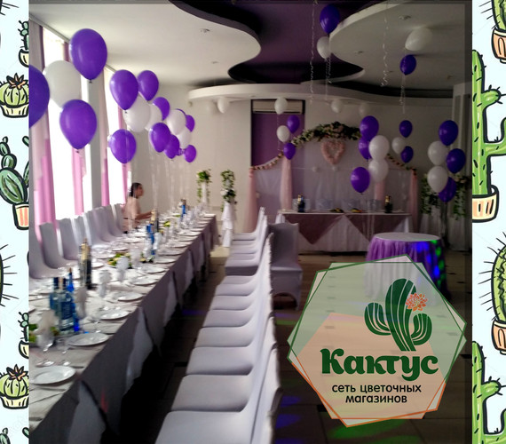 Украшение зала бело-фиолетовыми гелиевыми шарами.