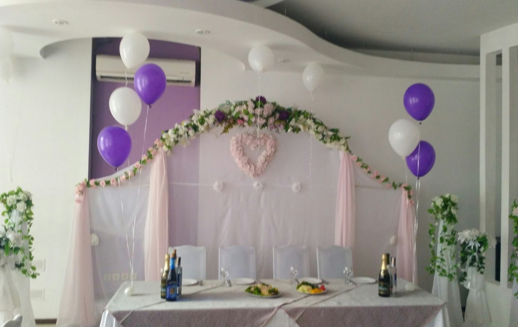 Украшение зала гелиевыми шарами в бело-фиолетовых тонах