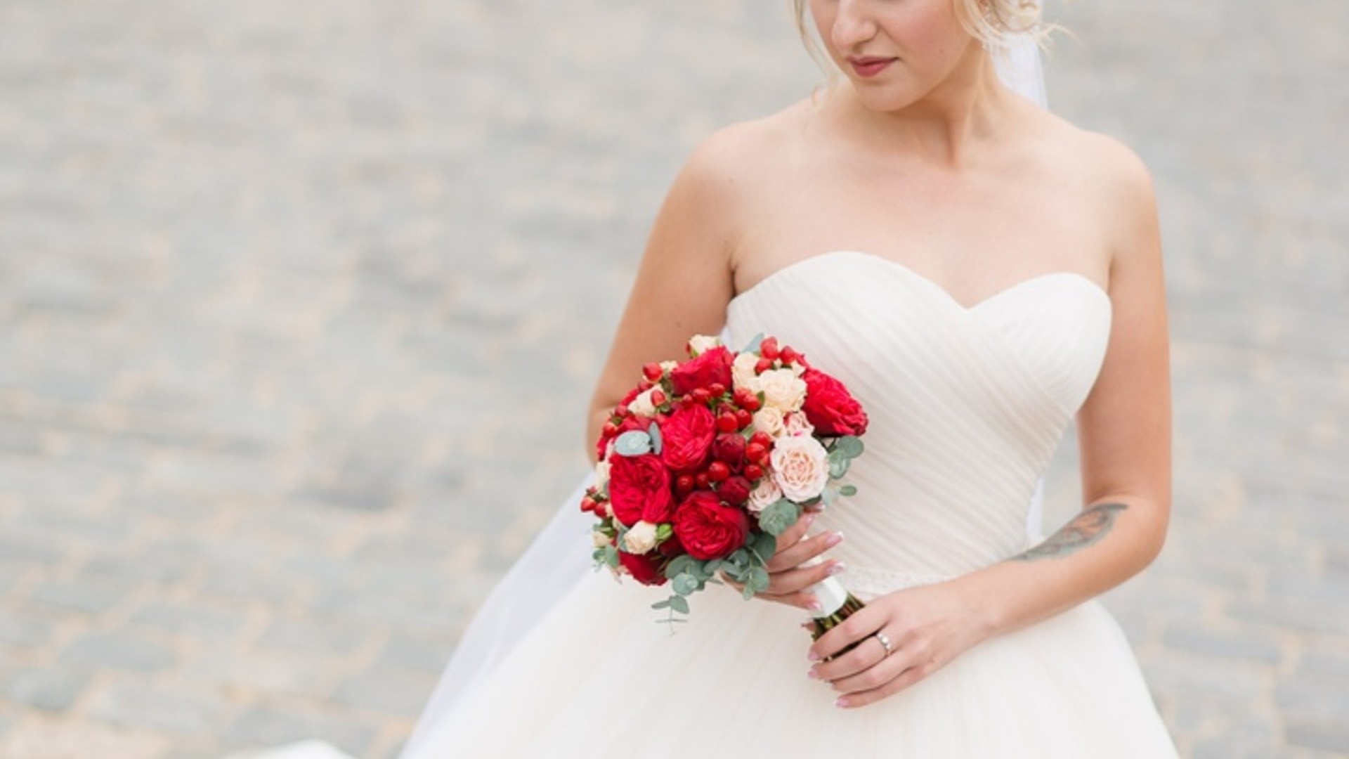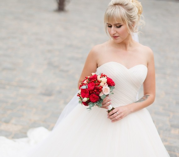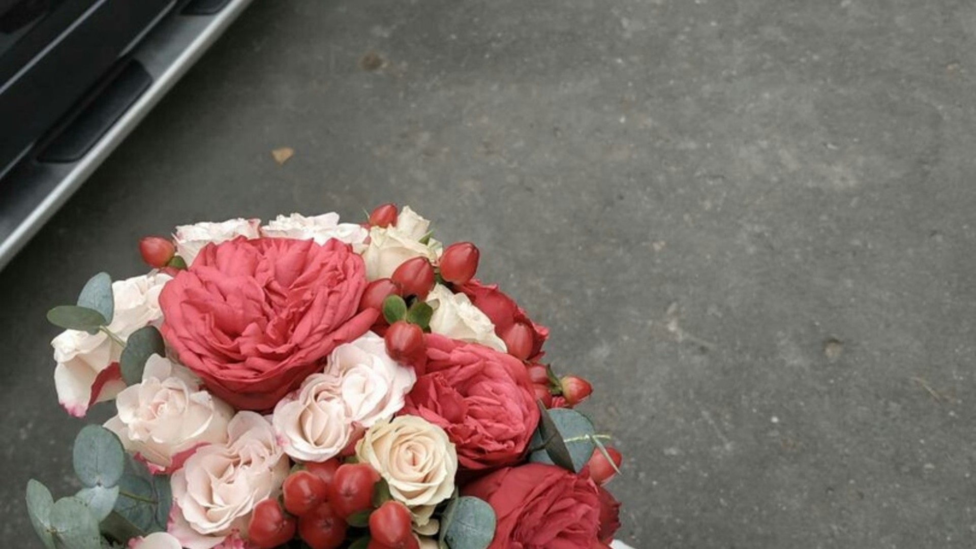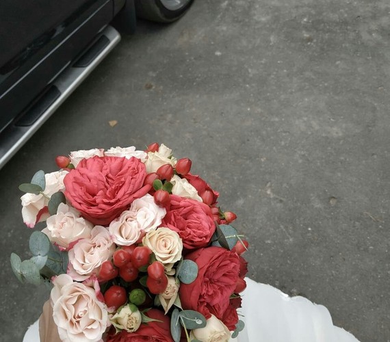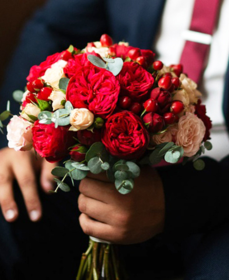 пионовидная роза цвета Марсал, пудровая кустовая роза, бледно-розовая кустовая роза, красные ягоды и эвкалипт