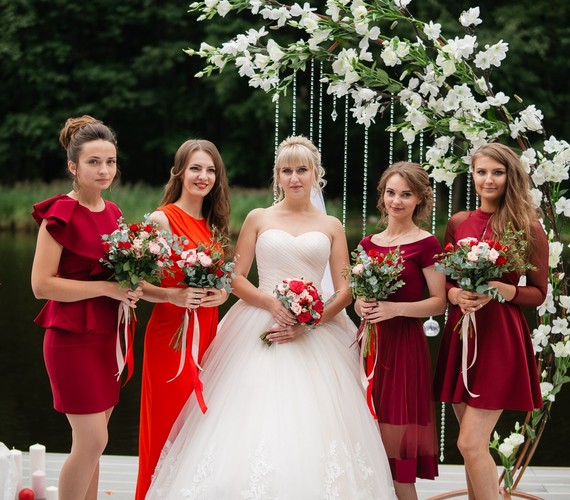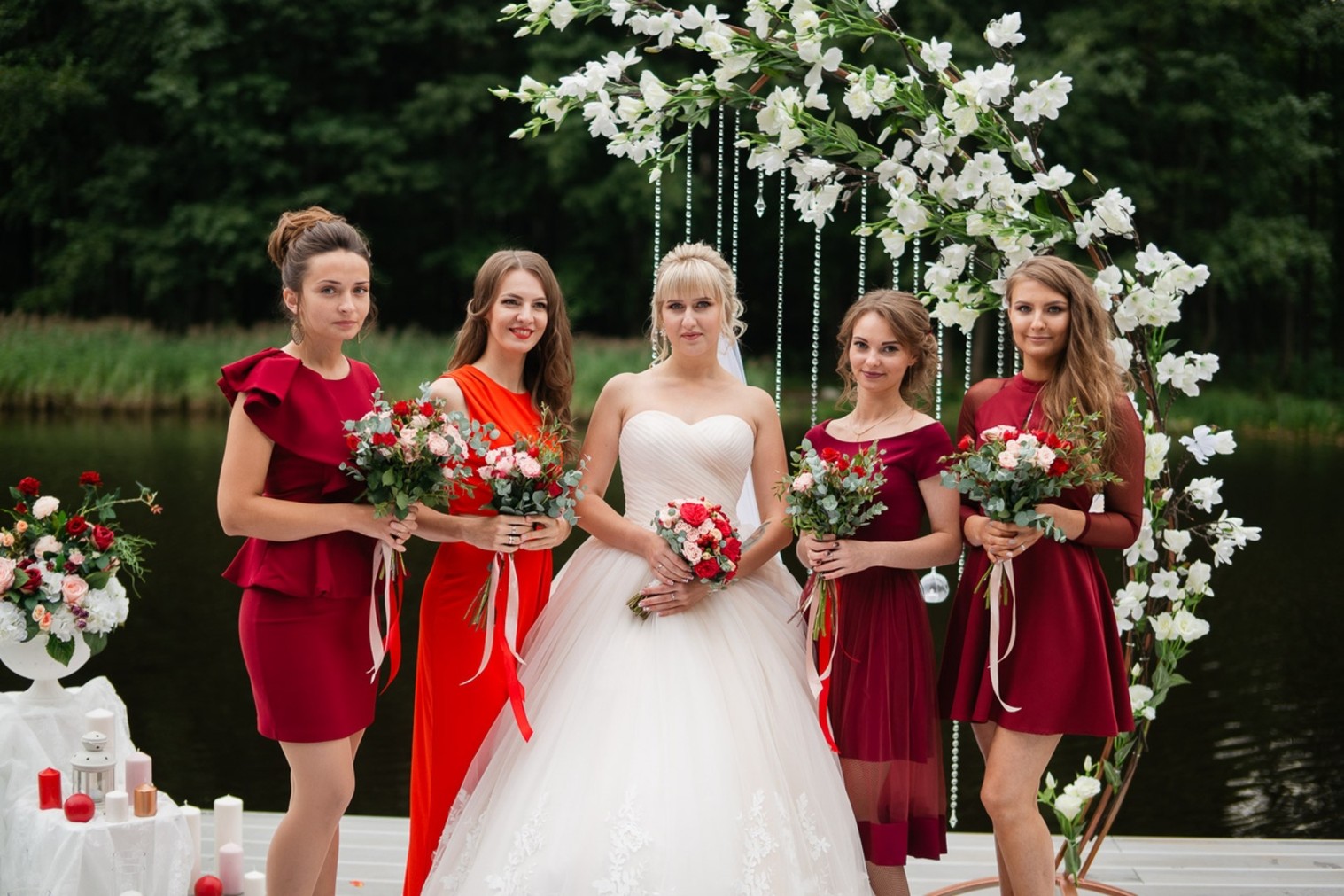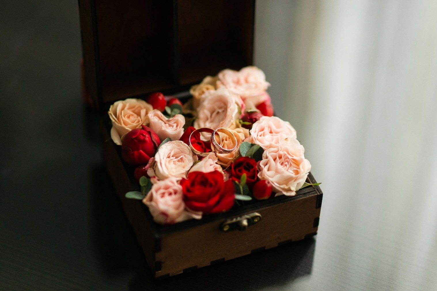 пионовидная роза цвета Марсал, пудровая кустовая роза, бледно-розовая кустовая роза, красные ягоды и эвкалипт