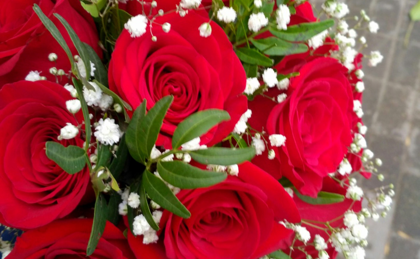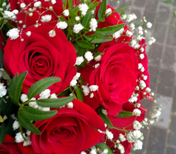 красная роза, гипсофил, зелень