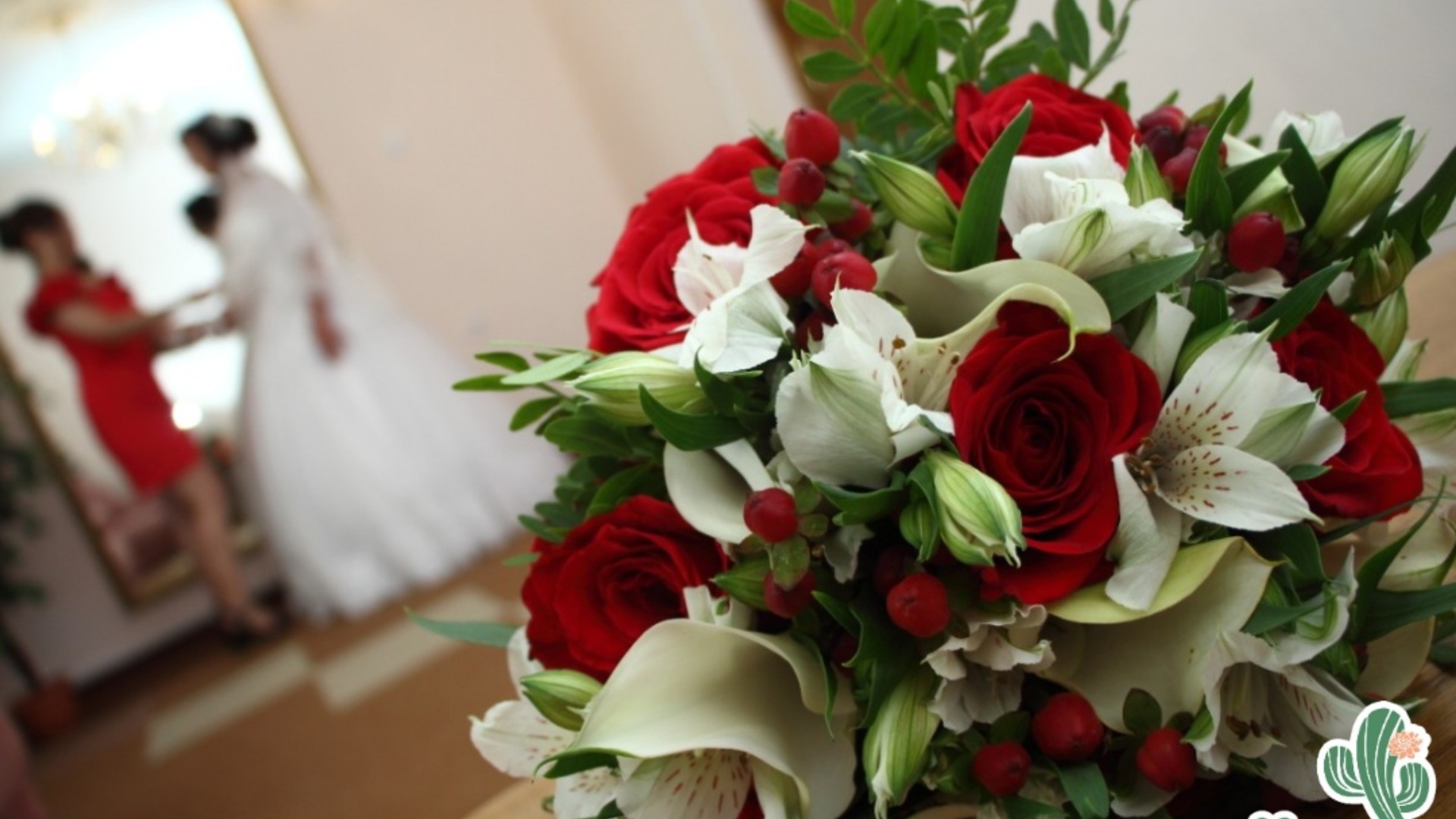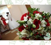 Сваденый букет из красных роз, калл и альстромерии. Заказ букета невесты необходимо выполнять за две недели до намеченного торжества. Дополнительно у нас Вы сможете заказать букет-дублер, букеты подружек, букет свидетельницы, бутоньерку для жениха.