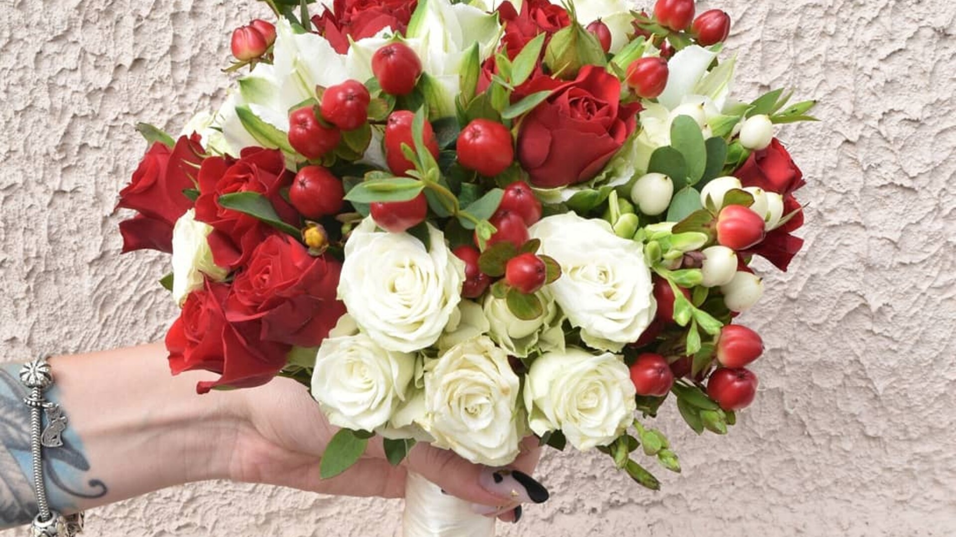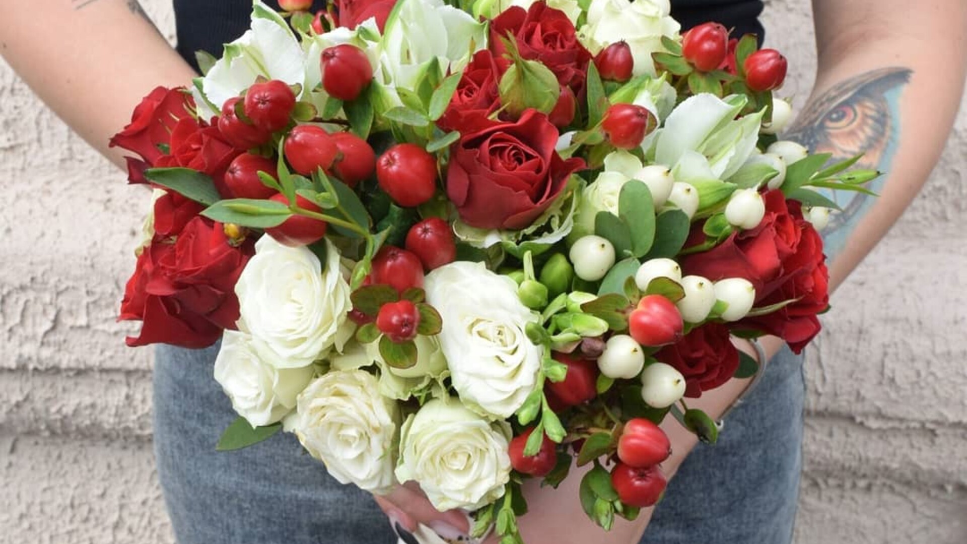 кустовая красная роза, зелень, гиперикум, фрезия, альстромерия