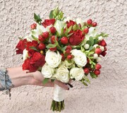 Сваденый букет из красной кустовой розы, зелени, альстромерии, ароматной фрезии и гиперикума. Заказ букета невесты необходимо выполнять за две недели до намеченного торжества. Дополнительно у нас Вы сможете заказать букет-дублер, букеты подружек, букет свидетельницы, бутоньерку для жениха.