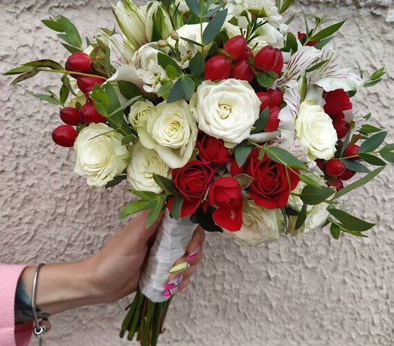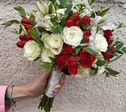 Сваденый букет из кустовых роз, альстромерии и экзотики в красных тонах. Заказ букета невесты необходимо выполнять за две недели до намеченного торжества. Дополнительно у нас Вы сможете заказать букет-дублер, букеты подружек, букет свидетельницы, бутоньерку для жениха.