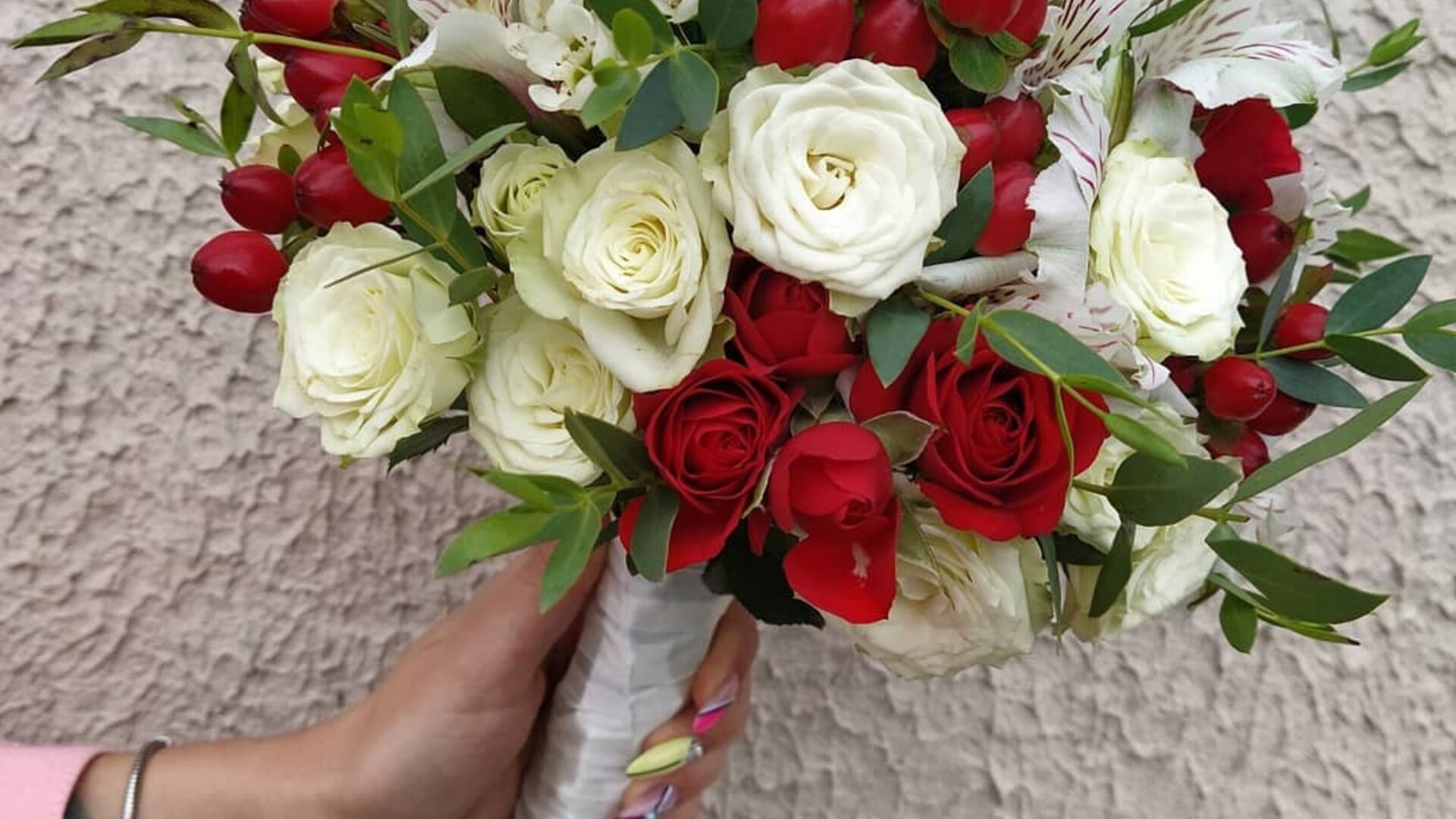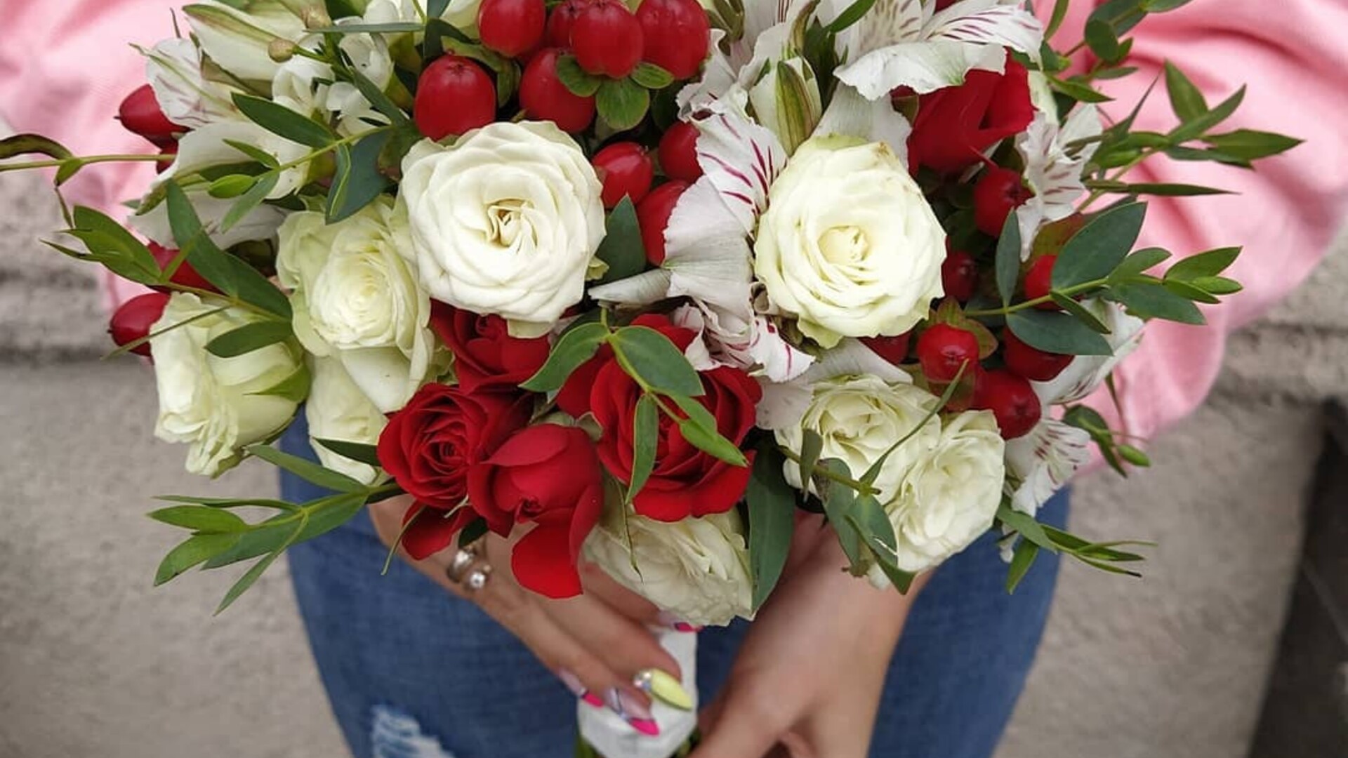 Кустовая роза, альстромерия, гиперикум, эвкалипт